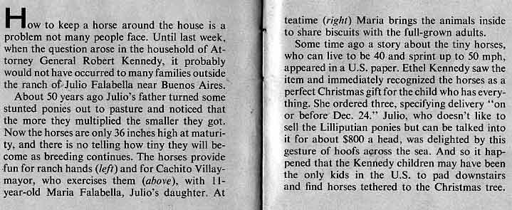 IT IS TRUELY INTRIGUING TO FLIP THROUGH THE PAGES OF THIS POPULAR MAGAZINE HAPPENING UPON AN ARTICLE WITH AN INTERVIEW WITH THE ACTUAL FALABELLA FAMILY IN ARGENTINA!!! WOW!! IT IS NOT COMPLETELY ACCURATE BUT SO WHAT!! THE MAGAZINE IS DATED JANUARY, 1963, OVER 40 YEARS OLD. IT IS PROOF ONCE AGAIN THAT THE FALABELLA IS A TRUE ONE OF A KIND HORSE THAT WILL CONTINUE TO GAIN POPULARITY AND RESPECT.